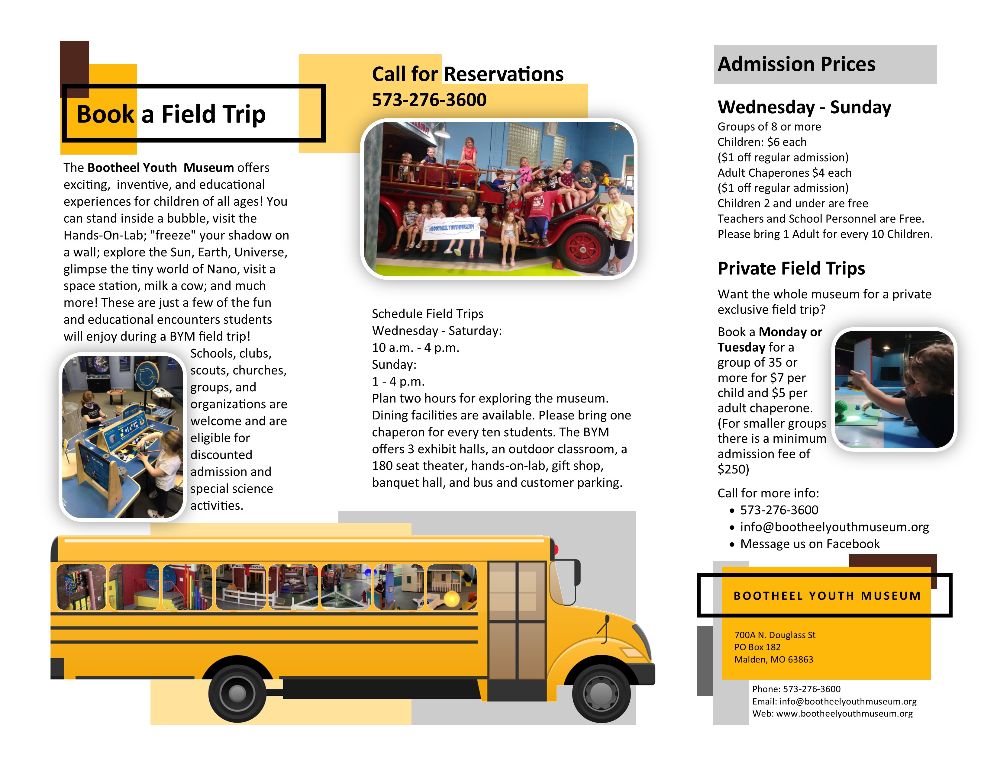 Private Field Trips Mondays or Tuesdays for groups of 35 or more children:
