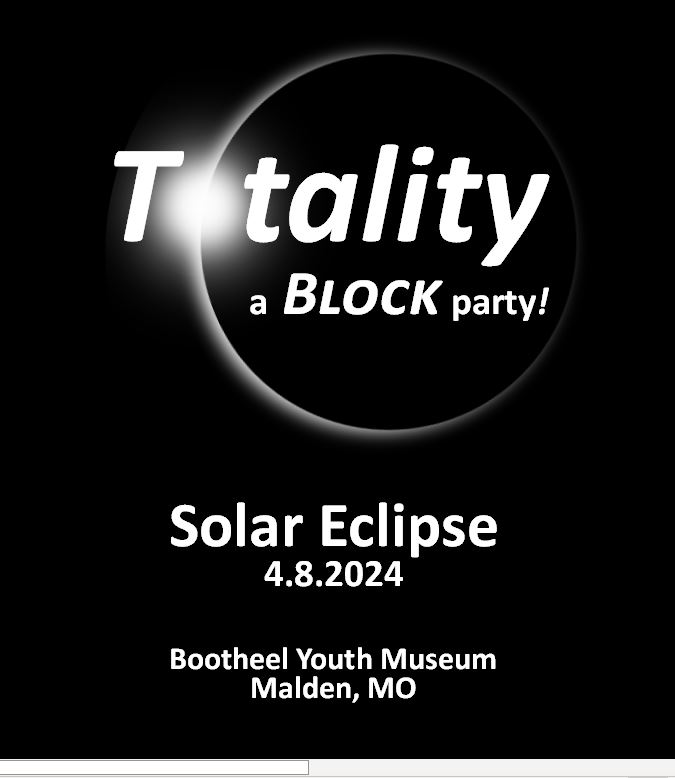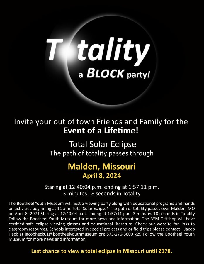 The Bootheel Youth Museum will host a viewing party along with educational programs and hands on activities beginning at 11 a.m. Total Solar Eclipse* The path of totality passes over Malden, MO on April 8, 2024. Starting at 12:40:04 p.m. with totality beginning at 1:57:11 pm ending at 2:00:29 pm for 3 minutes 18 seconds of totality. The eclipse ends at 3:16:21 as the moon uncovers the sun. Follow the Bootheel Youth Museum for more news and information. *Last chance to view a total eclipse in Missouri until 2178.Are you in the path of Totality check the map: https://nationaleclipse.com/maps.html The BYM Giftshop Eclipse will have certified safe eclipse viewing glasses and educational literature. Check our website for links to classroom resources. Schools interested in special projects and or field trips please contact Jacob Heck at jacobheck01@bootheelyouthmuseum.org 573-276-3600 x29 #inthepathoftotality