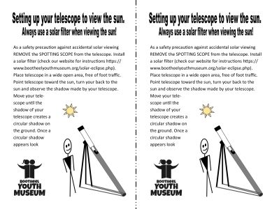 Viewing any part of the bright Sun through a camera lens, binoculars, or a telescope without a special-purpose solar filter secured over the front of the optics will instantly cause severe eye injury.* Eclipse Glasses and Viewers should have a minimum Filter rating of ISO12312-2.